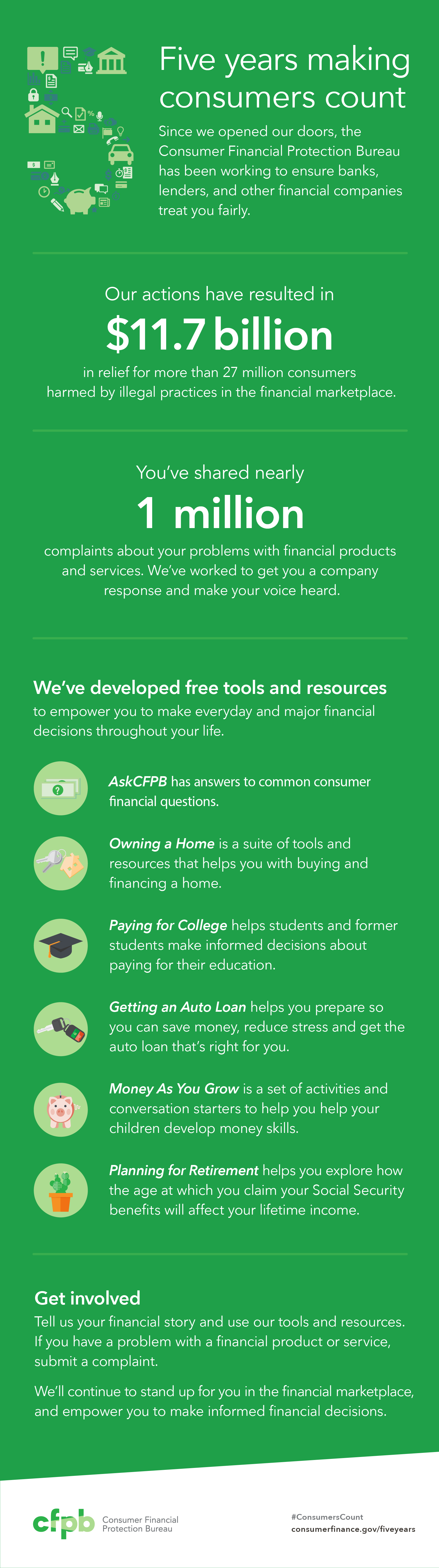 Since we opened our doors, we’ve focused on making the financial marketplace work for consumers. We’ve listened to your complaints about problems with your financial companies, created new consumer protections for financial products and services, and held bad actors accountable for breaking the law. We’ve also created new tools and resources to help you navigate financial decisions, like choosing a mortgage or an auto loan, or deciding at what age to claim Social Security retirement benefits.