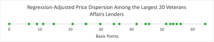 We show four figures for different segments of the market: Government Sponsored Entities, Federal Housing Administration, Veterans Affairs, and the jumbo market.11 As in the analysis above, we normalize the cheapest lender in each segment to 0 basis points. The figures show that regression-adjusted price dispersions for the four segments are, respectively, 41, 61, 64, and 57 basis points.