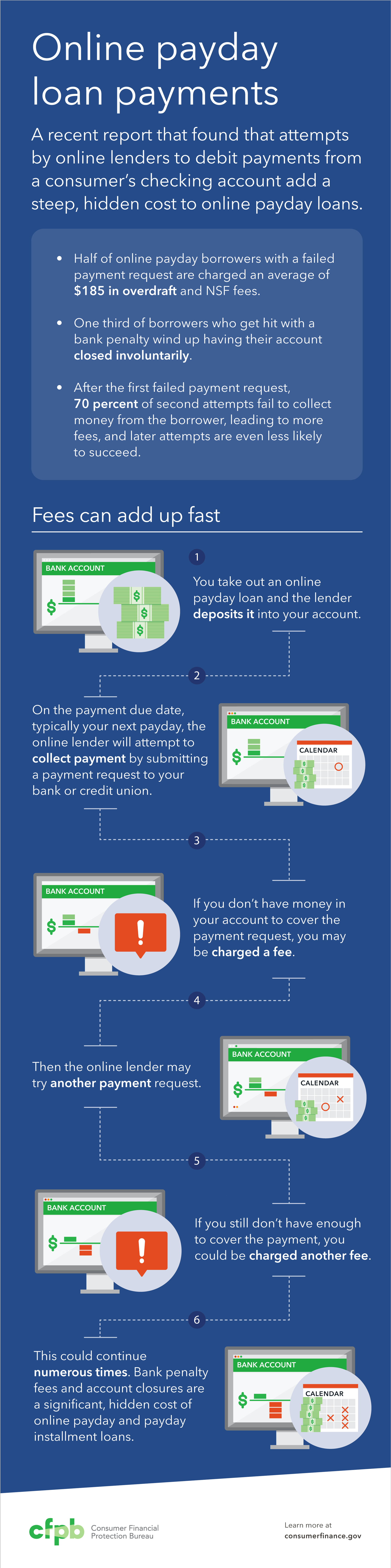 We recently released a study about payments for online payday loans and other high-cost online loans and their effects on consumers. We found that online lenders’ repeated attempts to debit payments from a borrower’s checking account add significant costs to online payday loans. Specifically, we found that after the first failed payment request, 70 percent of second attempts fail to collect money from the borrower, leading to more fees, and that later attempts are even less likely to succeed.