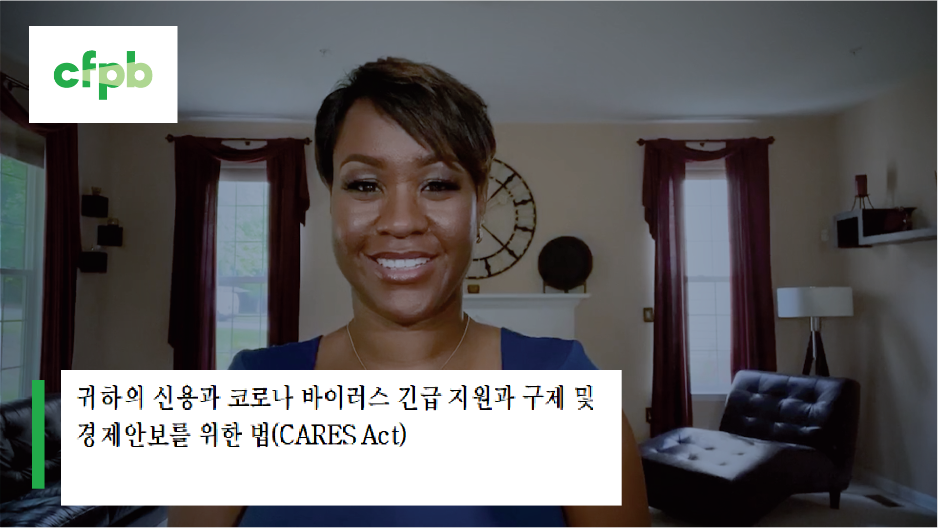 코로나 바이러스 긴급 지원과 구제 및 경제안보를 위한 법(CARES Act)은 신용 보고 기관에 귀하의 지불 정보를 보고하는 회사들에 대해 특별한 요건을 부과합니다. 이러한 요건은 귀하가 코로나 바이러스 대유행의 영향을 받고 있고 대출 기관이 지불 연기, 부분 납부, 연체금 지불 유예 또는 대출 조건 수정을 귀하와 합의하거나 기타 구제책을 제공하는 경우에 적용됩니다.