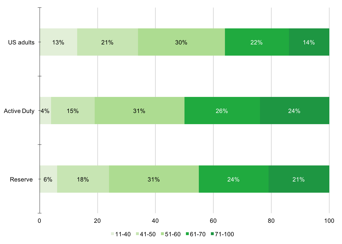 In addition to a higher average score, servicemembers had a larger concentration of individual scores at the higher end of the spectrum as you can see in the figure above. For example, 50 percent of active duty servicemembers and 45 percent of reserve component members had a score of 61 or higher, compared to just 36 percent of the general U.S. population.