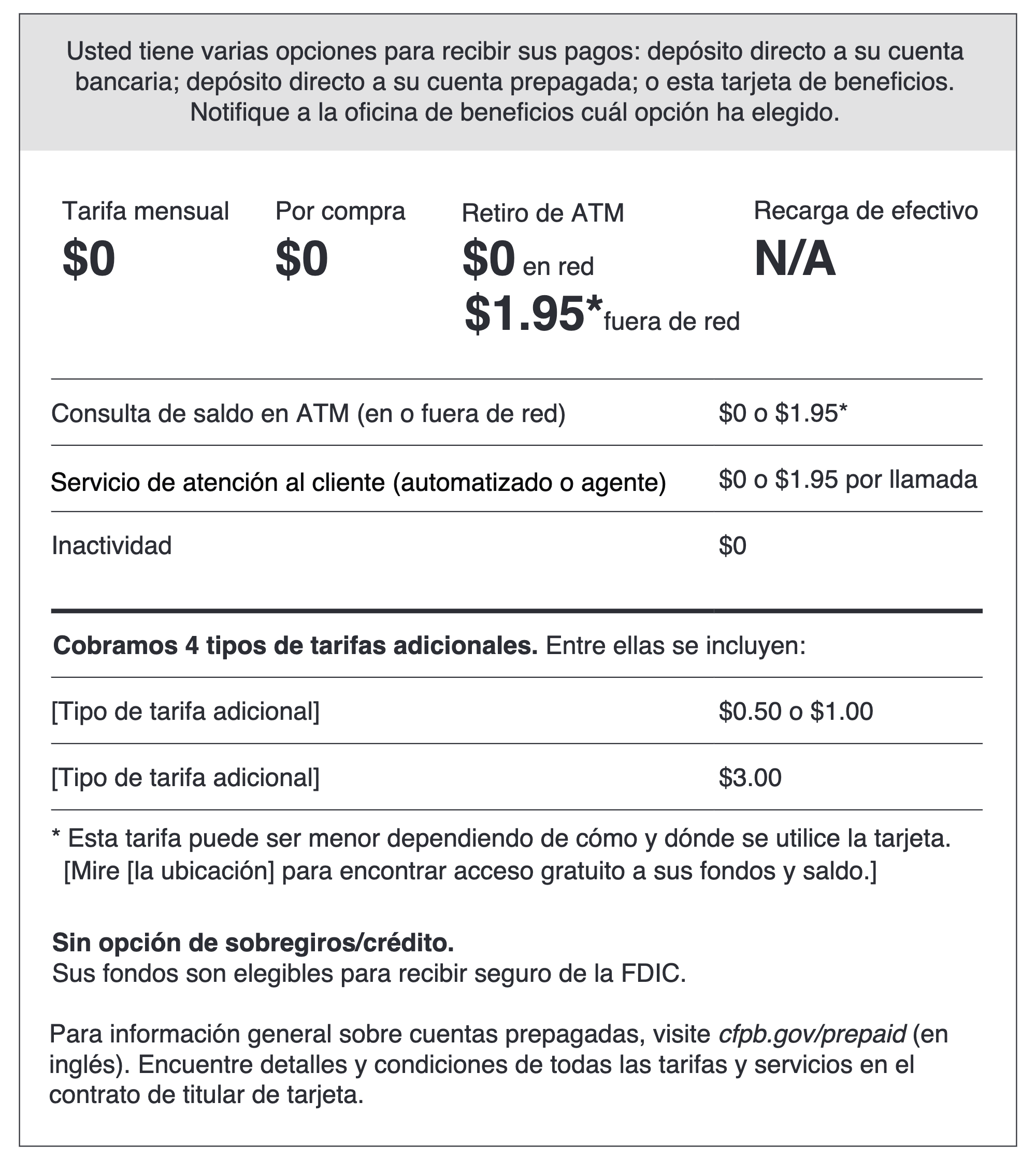 Si obtiene la tarjeta en una tienda, encontrará un breve resumen de las tarifas principales en la parte exterior del paquete o este será visible a través del paquete de la tarjeta prepagada. Este breve formulario incluirá un número gratuito y un sitio web para consultar todas las tarifas que podrían cobrarse en la tarjeta prepagada y otra información importante.